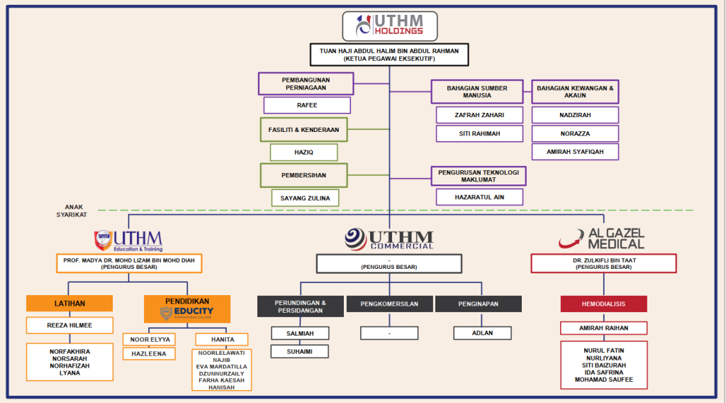 UTHM Holdings Sdn Bhd is a wholly-owned investment holding company of Universiti Tun Hussein Onn Malaysia. Incorporated on  18 February 2004 as UTHM Holdings Sdn Bhd  and presently manages these subsidiaries, UTHM Commercial Sdn. Bhd, UTHM Education & Training Sdn. Bhd. and Al-Gazel Medical Sdn. Bhd.